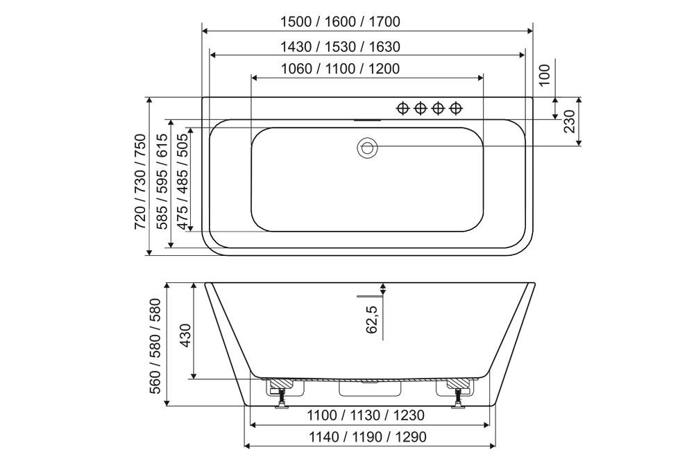 Cena zahŕňa telo vane, predný kryt, biely odtok Click-Clack a nohy vane. Prevedenie so štrbinovým prepadom.